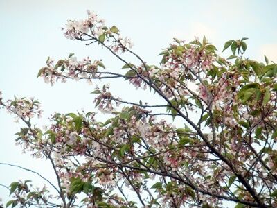 菜の花が間もなく終わりそうなのですが、通勤途中にある府立高校のソメイヨシノは最頂部付近にまだピンクの花を付けています。