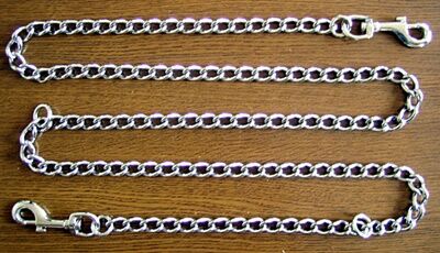 2mくらいの長さで、両端にナスカンが付いているタイプ、チェーン部分には、長さ調整出来るよう、ナスカンを引っ掛けるための丸カンが1個付いているものをご検討との事でした。